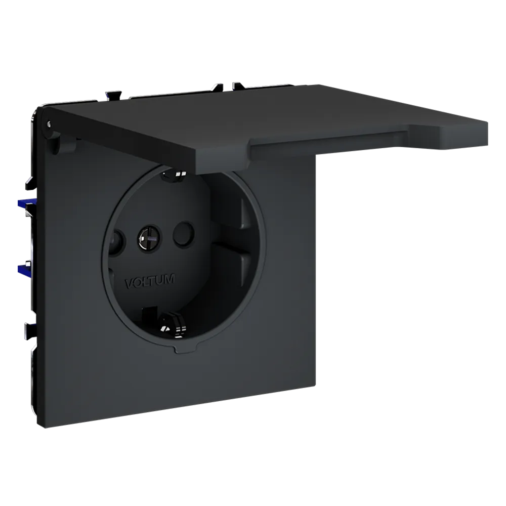 Розетка VOLTUM S70 с заземлением и защитными шторками и откидной крышкой  — это решение максимальной безопасности и эстетики для современного интерьера. Идеально подходит для детских комнат, ванных, прихожих, кухонь и уличных зон под навесом, где важна защита от пыли, брызг и случайного контакта с токоведущими частями.